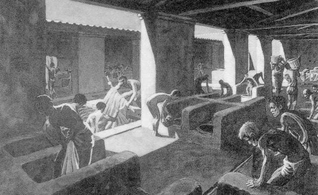 Звучит странно, но это работало: со временем из мочи образуется аммиак, один из лучших доступных тогда обезжиривателей, который помогает выводить с шерсти жир и грязь. Это не маргинальная практика, а первая в истории коммерческая прачечная.