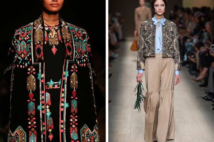 Свободные, многослойные образы — объемные жакеты и блузы с богатой вышивкой, ткани с этническими мотивами и натуральными оттенками. Макси-юбки, просторные платья, накидки и жилеты, создающие образ путешественника и единения с природой.